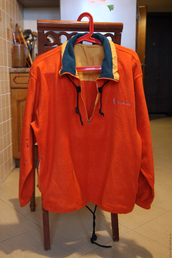 Рыжая флиска (образец № 1) была куплена мною в секонд-хенде (а точнее, у человека, который им спекулировал) ещё в конце прошлого века за какие-то смешные, насколько я помню, деньги. Была со мной во множестве путешествий. Надевается через голову, что, с одной стороны, не очень удобно, с другой — это теплее и отказоустойчивее. У неё периодически выпадают звенья тракторных молний, движки соскакивают, приходится их перенадевать и укорачивать молнию путём зашивания (чтобы движок не ехал дальше, чем поломка). Имеет кучу прожжёностей от искр и тому подобного. Быстро марается, особенно воротник, но и легко отстирывается.