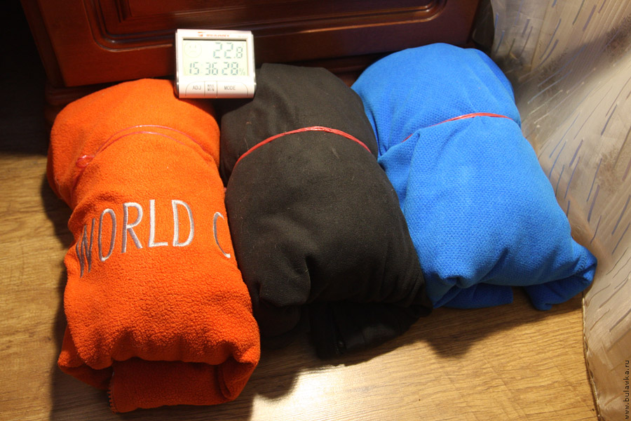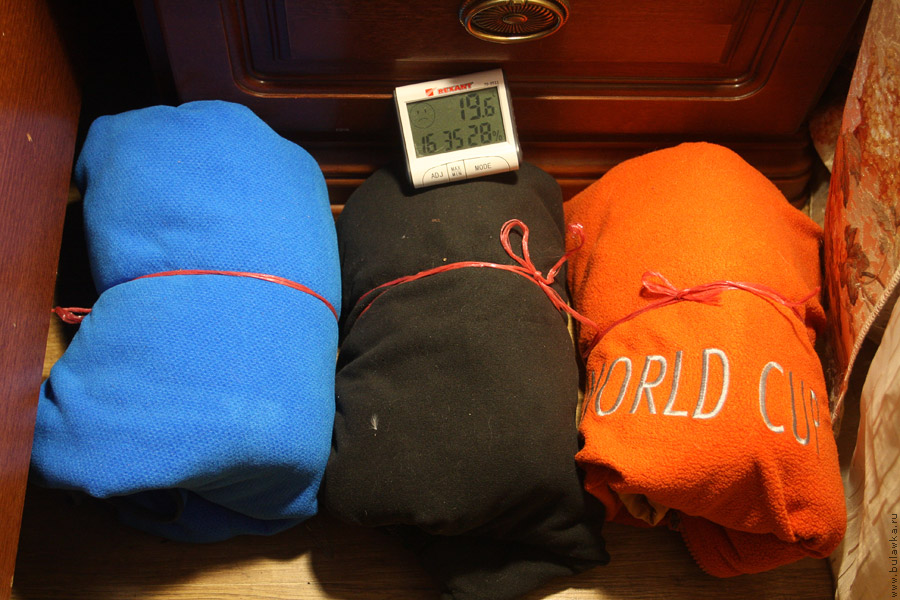 Свернув таким образом три кофты в три рулончика, я отнёс их в место где их никто не побеспокоит, поставил сверху термометр и эксперимент начался. Рулончики старался особо не прижимать друг к другу, чтобы они друг друга не особо остужали.