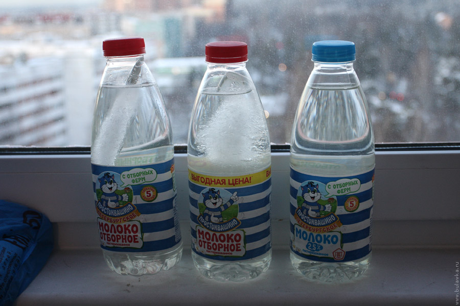 На следующий день примерно через сутки после начала эксперимента я развернул бутылки. Это было как раз вовремя, ибо одна бутылка полностью растаяла, а в других лёд ещё оставался.