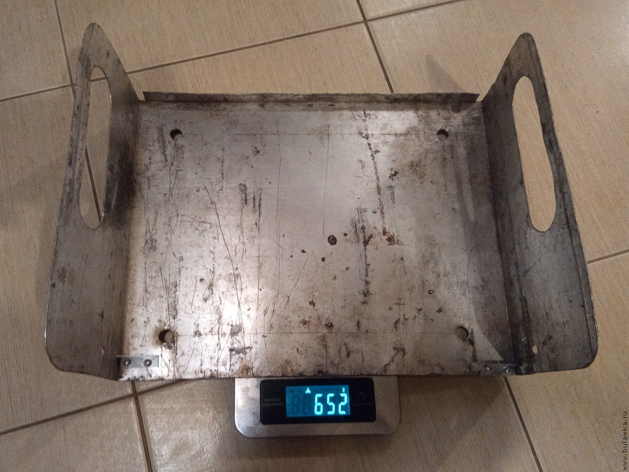 В результате в поход решили взять шатёр Иваныча и печку Кости (она оказалась компактнее остальных), но вместо составной трубы от неё решили взять самораскатывающуюся трубу-лист от печки Иваныча (у меня такая же, только более прогоревшая). Из моего взяли только лопату-лист, одновременно являющийся подставкой под печь (его я сделал много лет назад из алюминиевого поддона от холодильника).