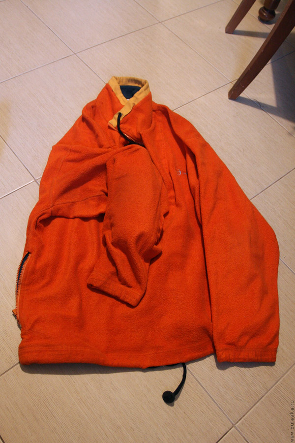 Рыжая флиска (образец № 1) была куплена мною в секонд-хенде (а точнее, у человека, который им спекулировал) ещё в конце прошлого века за какие-то смешные, насколько я помню, деньги. Была со мной во множестве путешествий. Надевается через голову, что, с одной стороны, не очень удобно, с другой — это теплее и отказоустойчивее. У неё периодически выпадают звенья тракторных молний, движки соскакивают, приходится их перенадевать и укорачивать молнию путём зашивания (чтобы движок не ехал дальше, чем поломка). Имеет кучу прожжёностей от искр и тому подобного. Быстро марается, особенно воротник, но и легко отстирывается.