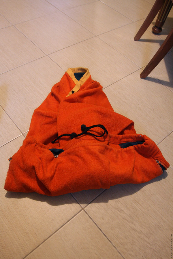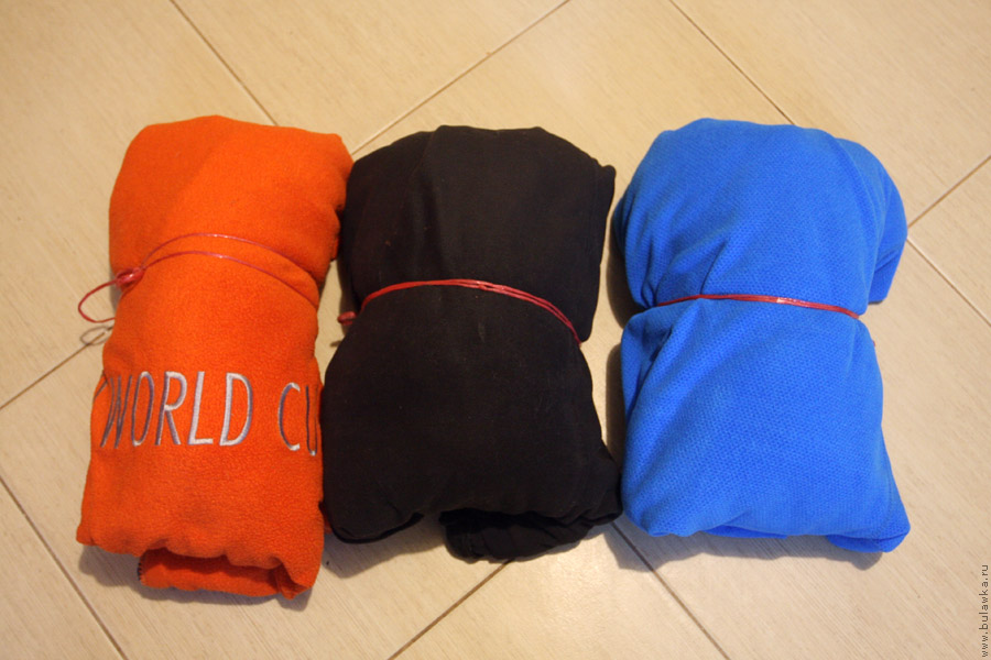 проводящейся тогда в Чупе (Белое море). На самом деле она не флиска, а сшита из виндстоппера или Голубая флиска (образец № 3) была подарена мне в 2020 году тоже на мультиспортивной гонке «Red Fox Adventure Race», проводящейся тогда в Карелии, в районе острова Койонсаари. Это тоже не флис, а не помню что. Ребята из «Редфокса» называли, но я забыл. Я её ношу чаще в городе, поскольку выглядит она ещё прилично. Но и в путешествия беру, как правило на «выход». Есть у меня и ещё какие-то аналогичные кофты с аналогичных волонтёрств, как минимум одна, но я их откладываю «на потом» и даже ещё не распаковывал. )) В чём же заключалась суть придуманного мною эксперимента? Я решил сравнить скорость таяния льда, теплоизолированного этими кофтами, точнее сравнить массы нерастаявшего льда через некоторое время. Итак, я взял три одинаковые литровые молочные бутылки (но с разными этикетками, чтобы их не перепутать) объёмом по одному литру (на самом деле, чуть меньше, шринкфляция); наполнил их водой, плотно закрутил и заморозил в морозилке, получив через некоторое время три бутылки со льдом. Затем завернул эти бутылки каждую в свою флиску. Заворачивал так: засовывал бутылку в рукав, рукав клал на кофту, сверху другой (пустой) рукав; потом низ по бутылке подгибал вверх, верх аналогично подгибал вниз, скручивал всё в рулончик и перехватывал верёвочкой.