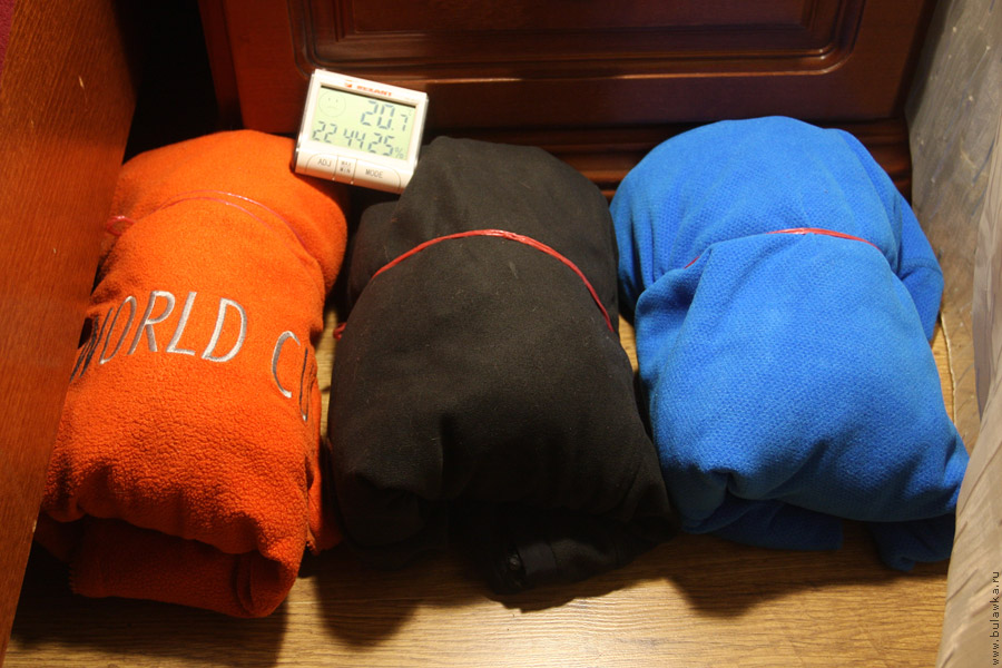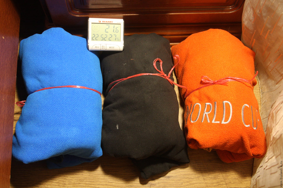 Свернув таким образом три кофты в три рулончика, я отнёс их в место где их никто не побеспокоит, поставил сверху термометр и эксперимент начался. Рулончики старался особо не прижимать друг к другу, чтобы они друг друга не особо остужали.